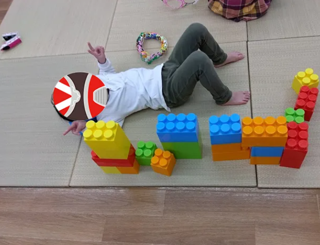 いつも活発に動いているお友だちが、冬休み明けに、少し疲れた様子で「今日は疲れているからおやすみ~」と言いながらおもむろに、畳の上に大きなブロックを重ねて塀を作りました。4マスブロック一つを持ち「これは枕にしよう。」と言いゴロン。