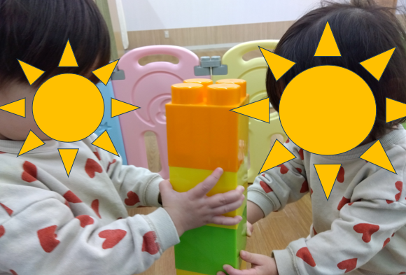 本日は仲良く一緒にマスブリックスというブロックを積み上げているお友達の1コマを撮影させてもらいました。