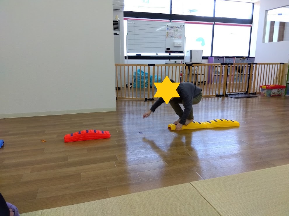 ただ落ちているものを拾うのではなく、今回は平均台を渡り、途中で止まって拾う課題となっており、足元を見つつバランスも取ることも必要です。