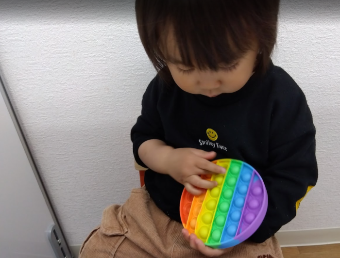 プッシュポップも虹色なのでレベルアップすると色と個数を指定して押してもらったり、お互い競争し合いながらルール性やワーキングメモリを使うような課題にも発展した使い方で療育を行っています。