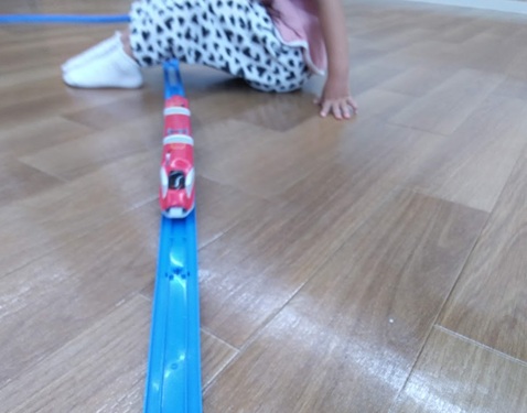 自由活動の際に、プラレールのレールを長ーくスタッフと楽しみながら連結をし、