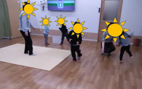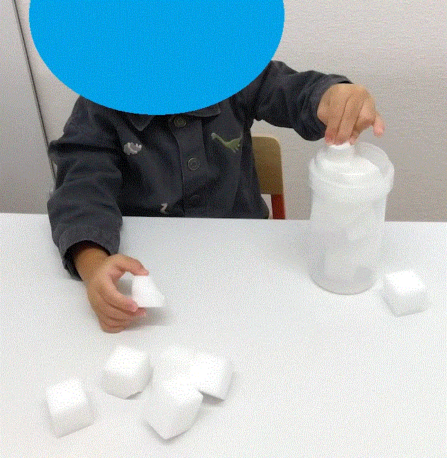 お掃除でもよくつかわれるメラニンスポンジですが、とても軽く素早く動いてしまうとすぐにおちてしまします。それを利用してついつい走りたくなる衝動性を抑えるコントロールや体全体のバランス感覚を養ってもらうねらいをもとに取り組んでもらいました。
