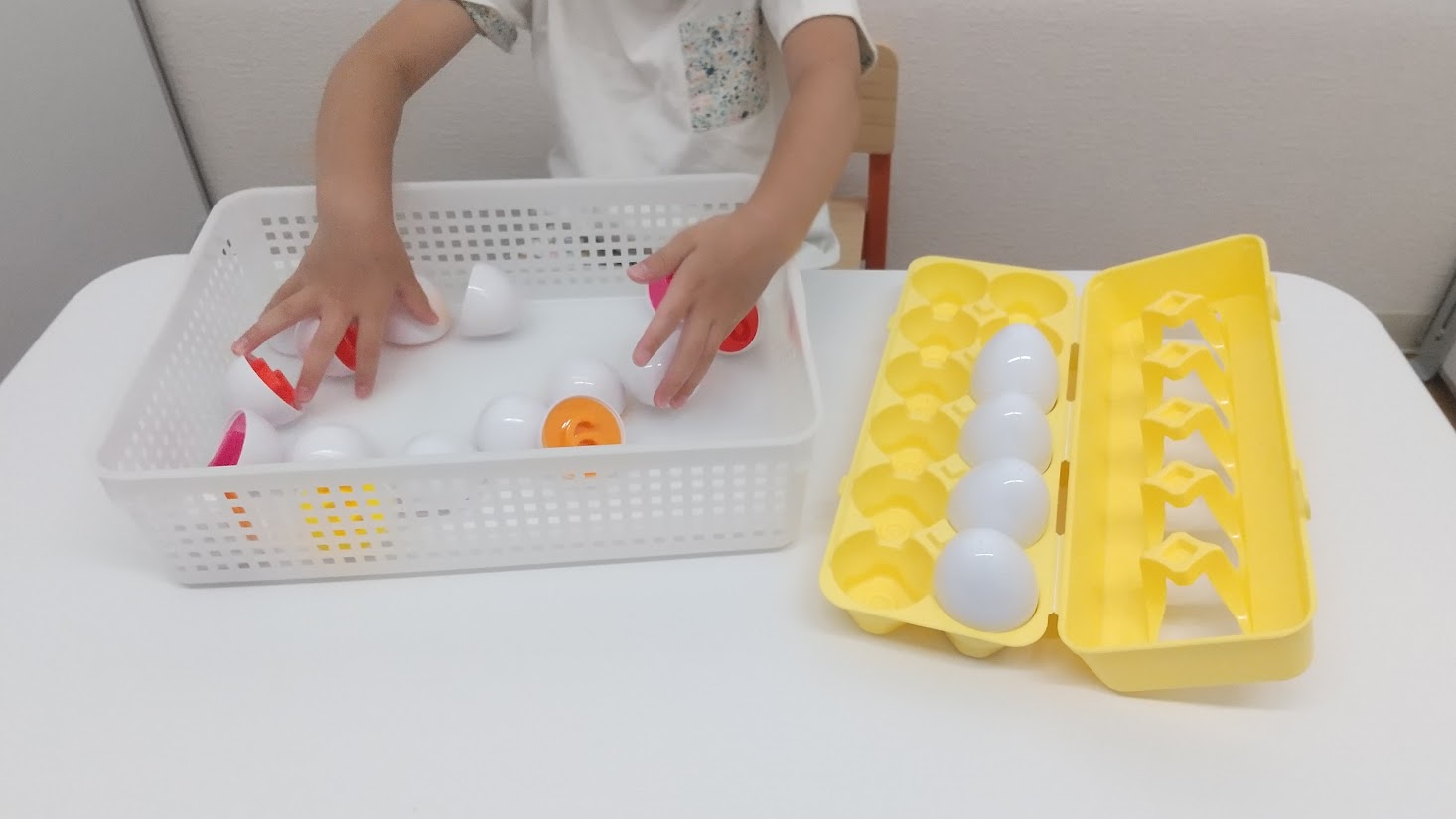 卵を割る・はめることで指先の筋力アップや形や色を想像する力など養うことが出来ていますよ🤓