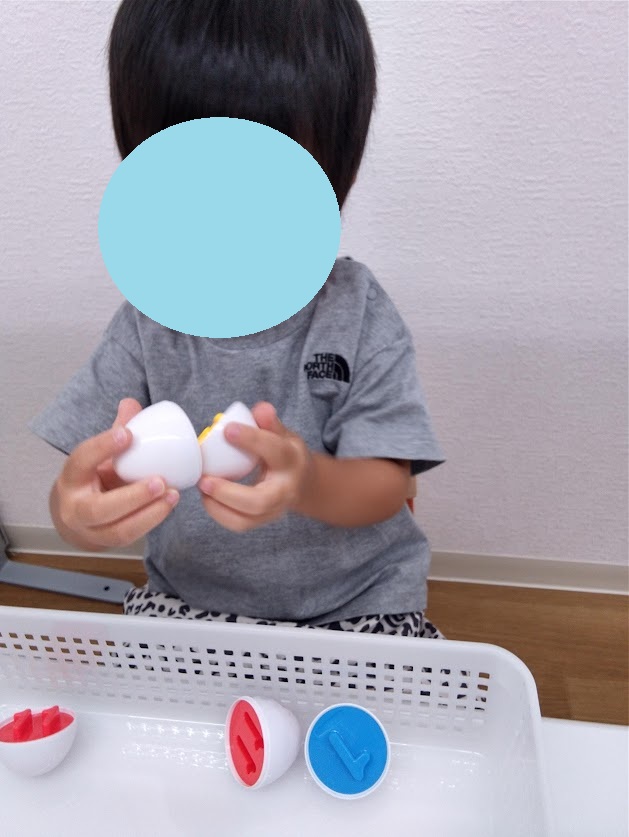 卵を割ると。数字・乗り物などが凸凹になっており合わせていきます。