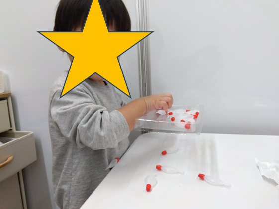 おさかなの先端についているキャップを外したり、つけたりしながら指先のトレーニングとして使用しています。
